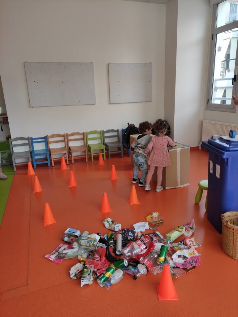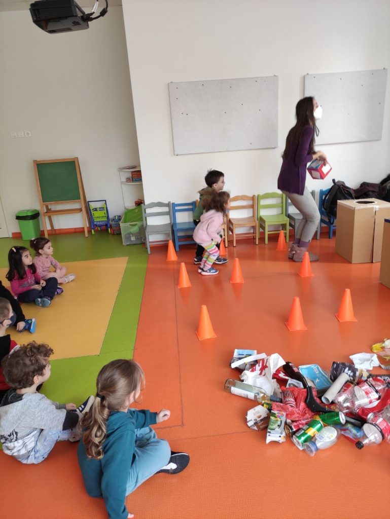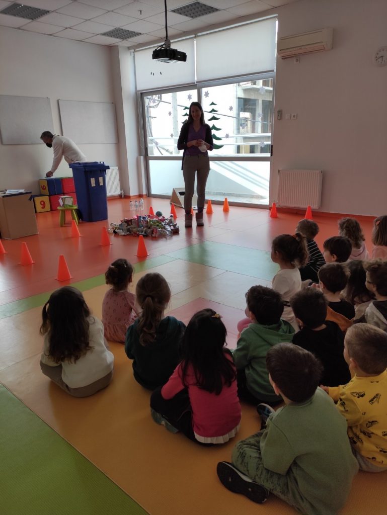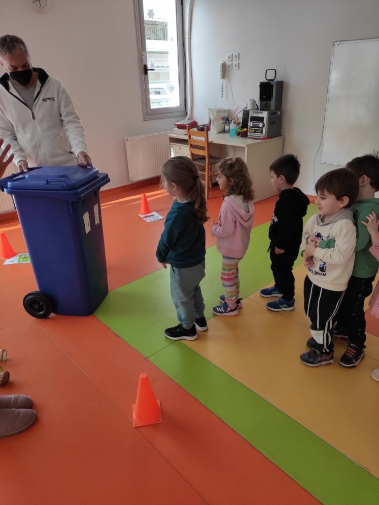 Σήμερα, Τετάρτη 18/1/2023 υποδέχτηκαμε στο σχολείο μας την θεατρική ομάδα Τρελό πατούσες σε μια βιωματική παράσταση για την ανακύκλωση. Στην αρχή γνωριστήκαμε με τον κύριο καδούλη και μάθαμε τι σκουπιδάκια του αρέσει να τρώει. Στη συνέχεια χωριστήκαμε σε ομαδούλες και ταξινομήσαμε τα σκουπιδάκια ανάλογα με το υλικό τους, αλουμίνιο, γυαλί, χαρτί και πλαστικό. Τοποθετήσαμε τα υλικά σαν ζωάκια στους κάδους ανακύκλωσης και τελειώνοντας απολαύσαμε το χορό της κυρίας πλαστικούλας, του κυρίου γυαλάκια, του αλουμινούλη και του χαρτάκια.