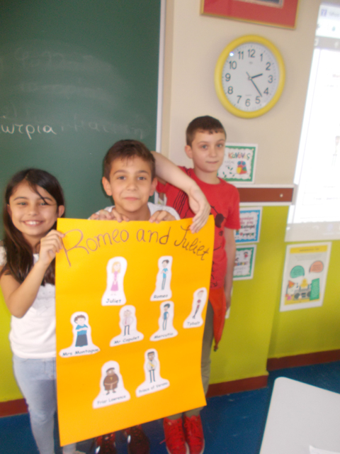 Έπειτα, συμμετείχαμε σε ένα παιχνίδι ερωτήσεων σχετικά με την υπόθεση του έργου, που μας άρεσε πολύ με αποτέλεσμα να την κατανοήσαμε ακόμα καλύτερα. Ενθουσιαστήκαμε δε όταν εμπλακήκαμε σε εκπαιδευτικό δράμα, με στόχο τη διερεύνηση των χαρακτήρων του έργου μέσα από τεχνικές του θεάτρου, όπως η ανίχνευση σκέψεων, το ομαδικό παιχνίδι ρόλων, ο ρόλος στον τοίχο, η ανακριτική καρέκλα και ο διάδρομος συνείδησης. Κατόπιν, συνεργαστήκαμε χωρισμένοι σε ομάδες και γράψαμε μια σελίδα από το ημερολόγιο του Ρωμαίου και της Ιουλιέτας σε κάποια από τις κρίσιμες στιγμές του έργου. Τέλος, μεταφερθήκαμε στη Βερόνα και χρωματίσαμε περίτεχνα σχέδια και ρομαντικά σκηνικά αυτού του κορυφαίου έργου. Στη συνέχεια τη σκυτάλη πήρε η δασκάλα των Αγγλικών κα Κάθυ, που, αφού μας πρόβαλε ένα υπέροχο βίντεο με την ιστορία στην αγγλική γλώσσα, μας μύησε σε ένα παιχνίδι ρόλων σχετικό με τους χαρακτήρες της ιστορίας και τις μεταξύ τους συνομιλίες. Ήταν μια πολύ ενδιαφέρουσα γνωριμία μας με τον μαγικό κόσμο του Σαίξπηρ, που θα μας μείνει αξέχαστη!