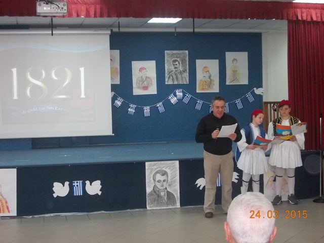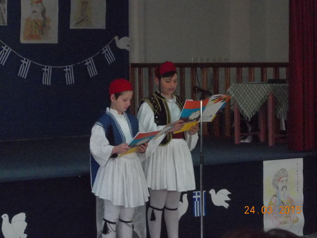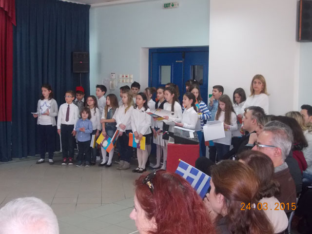 Σήμερα, Τρίτη 24 Μαρτίου 2015, πραγματοποιήθηκε στο σχολείο μας η γιορτή για την 25η Μαρτίου. Οι μαθητές της Στ’ τάξης παρουσίασαν θεατρικά δρώμενα και χορευτικά σε κλίμα ενθουσιασμού.
