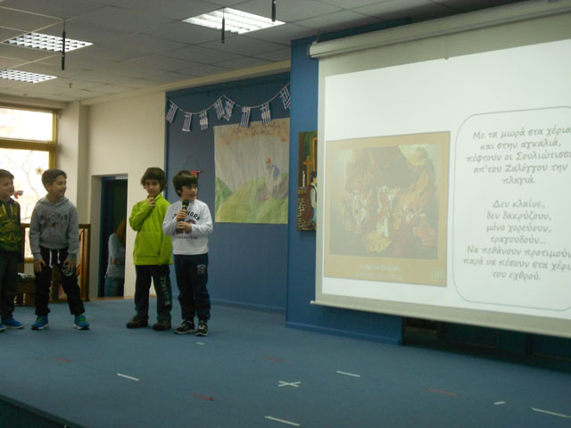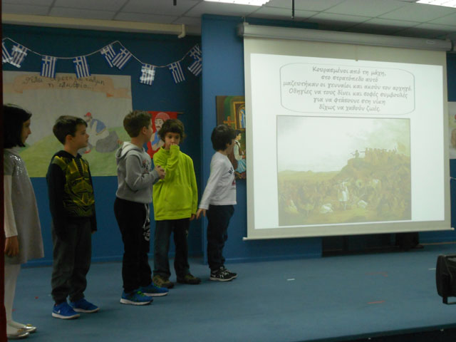 Παρακολουθήσαμε διάφορα θεατρικά, ακούσαμε ποιήματα και τραγουδήσαμε όλοι μαζί. Αύριο θα συνεχίσουμε τον εορτασμό της εθνικής επετείου στην τάξη μας με παρουσιάσεις , φύλλα εργασίας και σχετικό έντυπο υλικό.