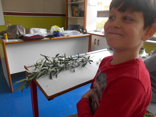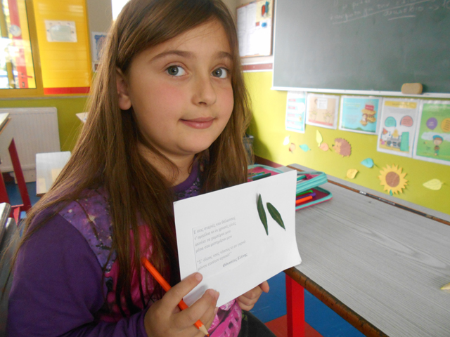Μιλήσαμε για τον καρπό της, για τα προϊόντα της, για το πόσα χρόνια ζει, αλλά και για το λάδι στη θρησκεία μας και στη μαγειρική. Ακόμη, παρατηρήσαμε λεπτομερώς τα φύλλα της και τα κλαδιά της και δοκιμάσαμε νόστιμες ελίτσες. Τέλος, διαβάσαμε το ποίημα του Ελύτη και μαζί με φύλλα ελιάς, το αποτυπώσαμε σε ένα χαρτί, για να το θυμόμαστε. Σε λίγες μέρες θα δραματοποιήσαμε και τον μύθο της διαμάχης της Αθηνάς και τον Ποσειδώνα για την ονομασία της Αθήνας όπου η Αθήνα προσέφερε το ιερό φυτό, την ελιά. Ήταν μια όμορφη διαθεματική προσέγγιση του φυτού αυτού!