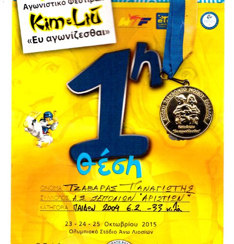 Ο μαθητής της Στ’ τάξης του σχολείου μας, Τζαβάρας Παναγιώτης διακρίθηκε στο 4ο αγωνιστικό Φεστιβάλ Kim e Liu «Ευ Αγωνίζεσθαι» το οποίο διεξήχθει στις 23-25 Οκτωβρίου 2015 στο Ολυμπιακό Στάδιο Άνω Λιοσίων.