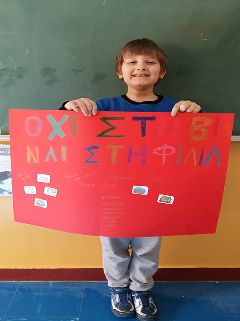 Αρχικά, διαβάσαμε το παραμύθι “Τα μπαλόνια της φιλίας” και συζητήσαμε για τα μηνύματα της αγάπης και της συνεργασίας που μας περνάει. Έπειτα, φτιάξαμε τα δικά μας μπαλόνια με συνθήματα κατά της βίας και υπέρ της φιλίας. Τέλος, δημιουργήσαμε τη δική μας αφίσα για τη μέρα αυτή. Σίγουρα πια όλοι μας υποστηρίζουμε :