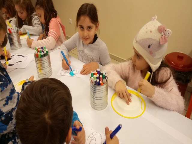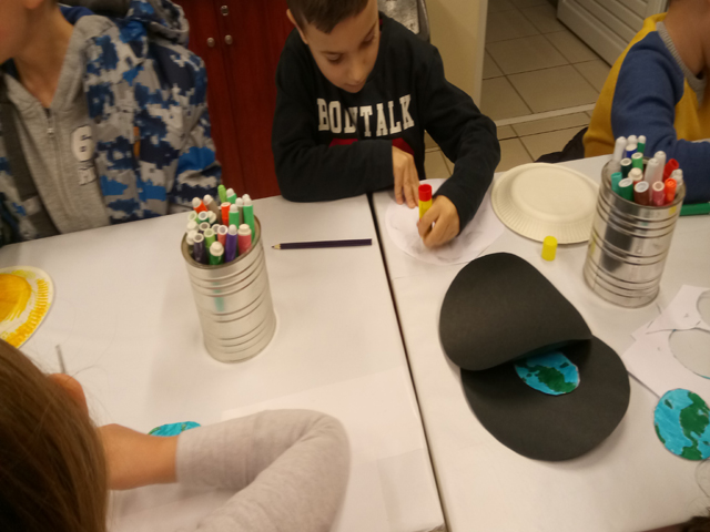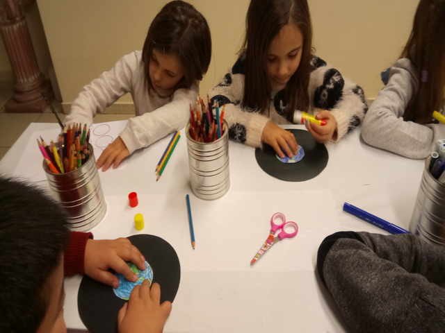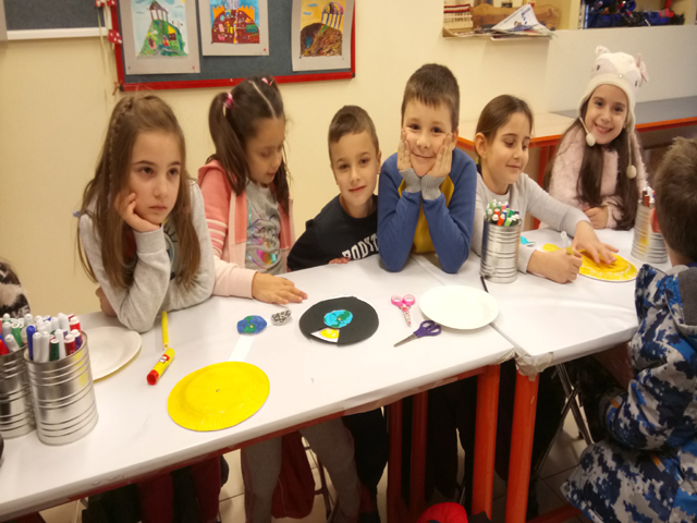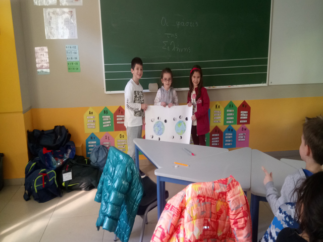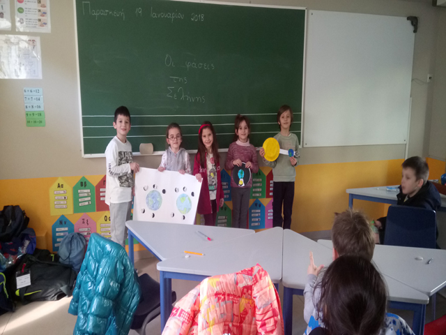 Ότι γυρίζει γύρω της και γύρω από τον άξονά του. Επίσης, γνωρίσαμε ότι στο φεγγάρι υπάρχουν κρατήρες, οι οποίοι έχουν δημιουργηθεί από τις συγγρούσεις με διαστημικές πέτρες, που πέφτουν πάνω του με μεγάλη ταχύτητα. Τέλος, ότι παρόλο που είναι τόσο λαμπερό δεν έχει στην πραγματικότητα το δικό του φως, αλλά αντανακλά το φως του ήλιου. Στη συνέχεια, σήμερα Παρασκευή 19 Ιανουαρίου 2018, αποφασίσαμε να επισκεφθούμε το εργαστήρι των Εικαστικών και να αναπαραστήσουμε, με απλά υλικά, την κίνηση της Γης γύρω από τον Ήλιο και της Σελήνης γύρω από τη Γη. Επίσης φτιάξαμε ένα κολλάζ και ένα μόμπιλε με τις φάσεις της Σελήνης. Ανυπομονούμε για την επόμενη επίσκεψη στο εργαστήρι.