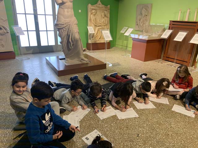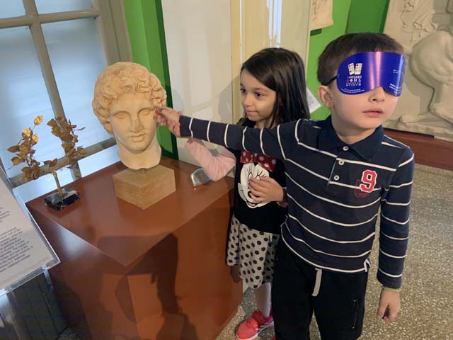 Τα παιδιά είχαν τη δυνατότητα να αγγίξουν τα εκθέματα, τα οποία είναι πιστά αντίγραφα των πρωτοτύπων που εκτίθενται σε άλλα Μουσεία της χώρας μας και του εξωτερικού. Έπειτα, η εμψυχώτρια μας εξήγησε τον τρόπο που καθοδηγούμε ένα άτομο με προβλήματα όρασης στο χώρο, και μας έδωσε μια μάσκα, προτρέποντάς μας να τη χρησιμοποιήσουμε για να καλύψουμε τα μάτια μας όταν αγγίζουμε τα εκθέματα.Τα παιδιά ψηλάφισαν όλα τα αγάλματα και τα περιέγραψαν με τη βοήθεια της αφής τους. Τέλος, με τη βοήθεια των εκπαιδευτικών, είχαν την ευκαιρία να έρθουν σε μια πρώτη επαφή με τη γραφή Braille και να γράψουν τα ονόματα τους. Ήταν μια πολύ ενδιαφέρουσα επίσκεψη που ευαισθητοποίησε τους μαθητές απέναντι στα άτομα με ειδικές ανάγκες.