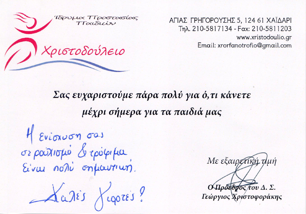 Σήμερα, Δευτέρα 18 Δεκεμβρίου 2017, επισκεφθήκαμε το Χριστοδούλειο Ίδρυμα προκειμένου να προσφέρουμε τρόφιμα, ρούχα και ένα χρηματικό ποσό που είχαμε συγκεντρώσει, ώστε να ενισχύσουμε το σπουδαίο έργο του ιδρύματος.