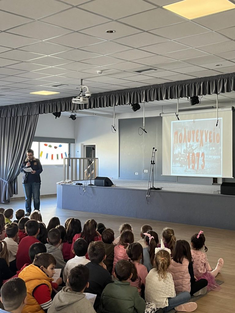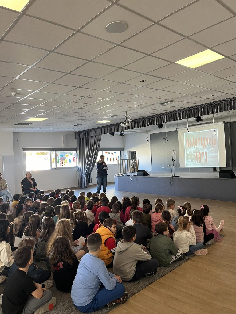 Σήμερα, Παρασκευή 17 Νοεμβρίου 2023, στο θέατρο του σχολείου μας, πραγματοποιήσαμε εορταστικές εκδηλώσεις για την επέτειο της εξέγερσης του Πολυτεχνείου. Μιλήσαμε για το χρονικό της εξέγερσης του Πολυτεχνείου και έπειτα τραγουδήσαμε διάφορα επετειακά τραγούδια .