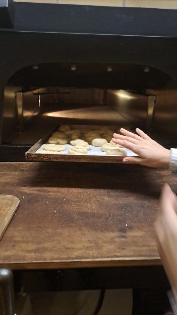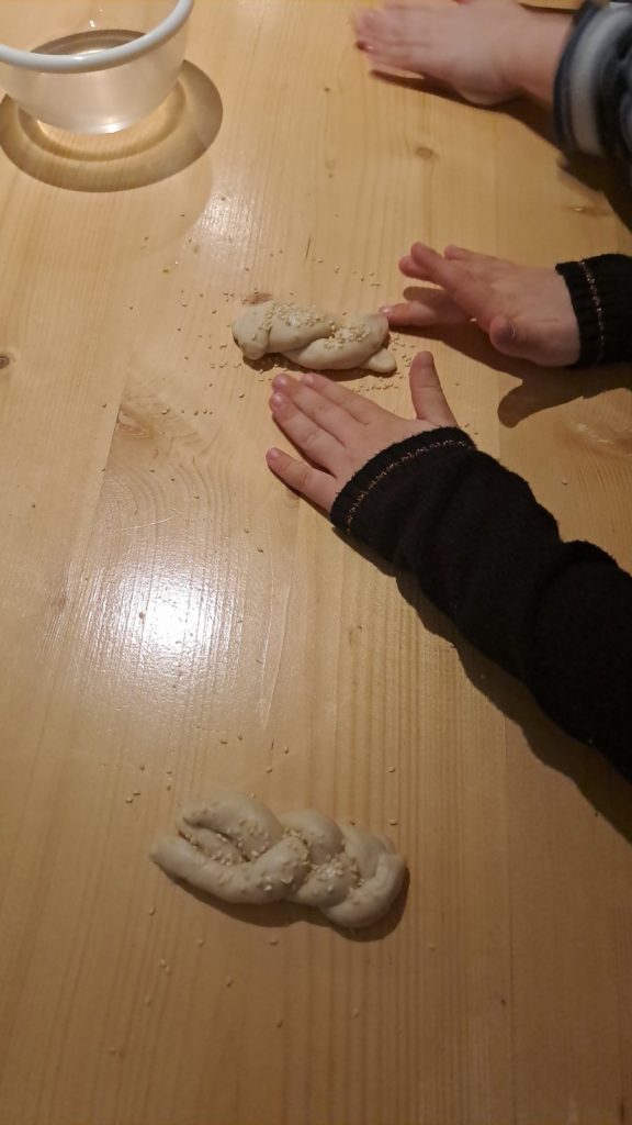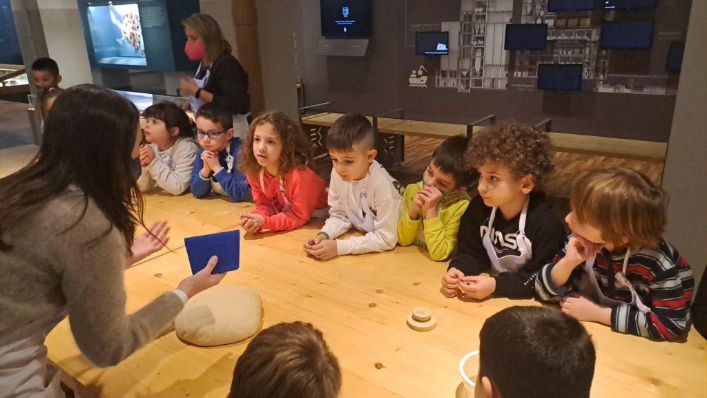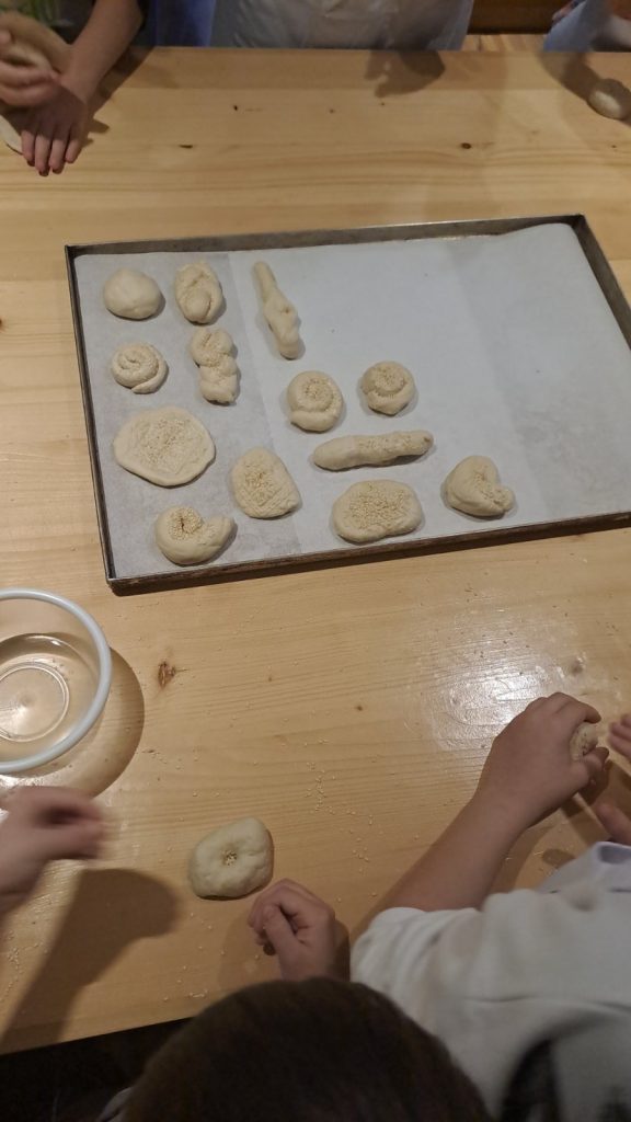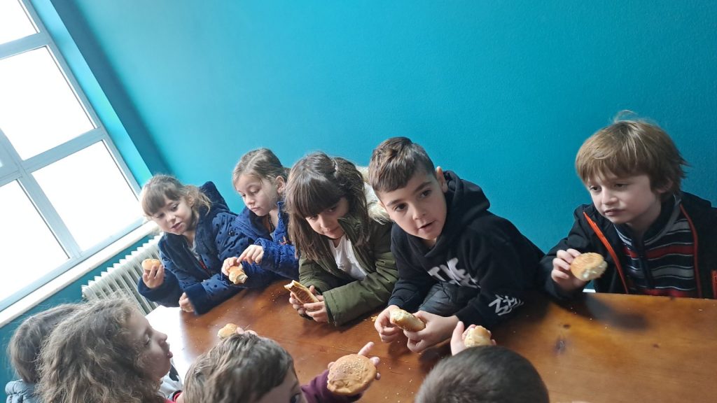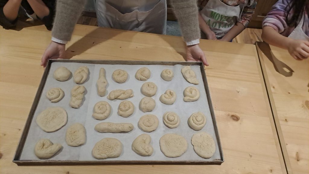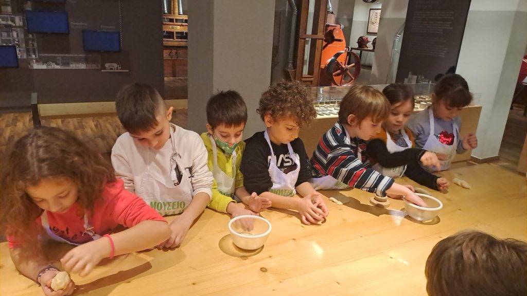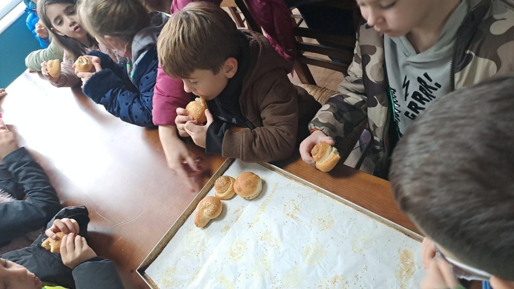 Γρήγορα βάλαμε κι εμείς τις ποδιές μας και με αγάπη και ενθουσιασμό ζυμώσαμε το δικό μας ψωμάκι. Όση ώρα χρειάστηκε για ναψηθούν τα ψωμάκια μας, μάθαμε πολλές πληροφορίες για το επάγγελμα του αρτοποιού αλλά και τα δημητριακά. Βλέποντας σχετικά βίντεο και παίζοντας παιχνίδια καταλάβαμε πόσο σημαντικό είναι να τρώμε υγιεινά και να μην σπαταλάμε τα τρόφιμα! Φεύγοντας φάγαμε με χαρά και ικανοποίηση τα ζεστά μοσχομυριστά ψωμάκια μας!
