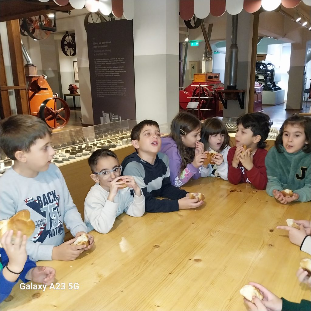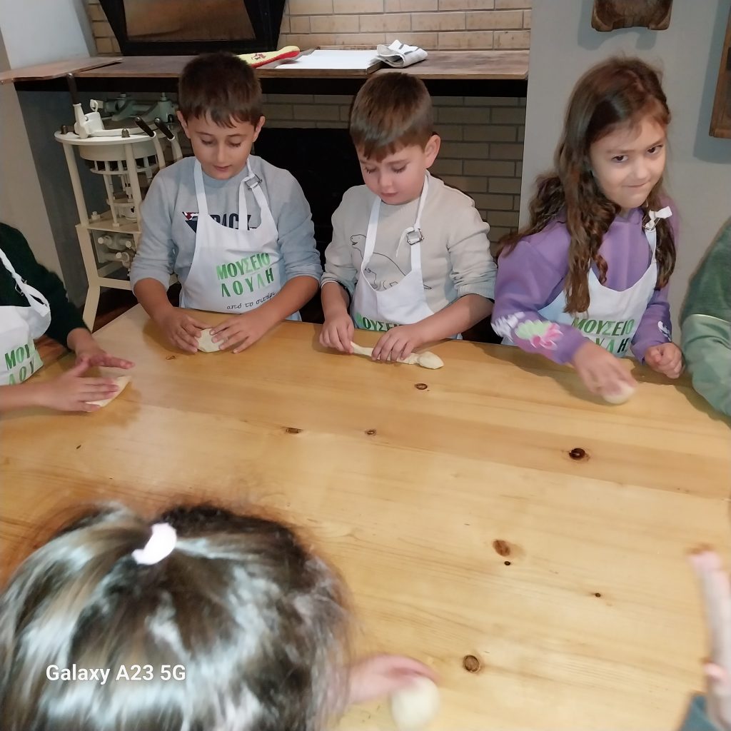 Σήμερα, Δευτέρα 16/12/2024, η εβδομάδα μας ξεκίνησε όμορφα και μυρωδάτα, με μια επίσκεψη στους Μύλους Λούλη. Μόλις, φτάσαμε την προσοχή μας τράβηξε η υπέροχη μυρωδιά του ψωμιού που είχε κατακλύσει το χώρο. Χωρίς να χάσουμε χρόνο βάλαμε γρήγορα τις ποδιές μας και με ενθουσιασμό ζυμώσαμε τα δικά μας ψωμάκια. Όση ώρα χρειάστηκε να ψηθούν τα ψωμάκια μας, περιηγηθήκαμε στους χώρους του μουσείου. Είδαμε γεωργικά εργαλεία και μηχανήματα που χρησιμοποιούνταν για την παρασκευή του αλευριού, γνωρίσαμε τα υπόλοιπα είδη των δημητριακών και παίζοντας παιχνίδια καταλάβαμε πόσο σημαντικό είναι να τρώμε υγιεινά!