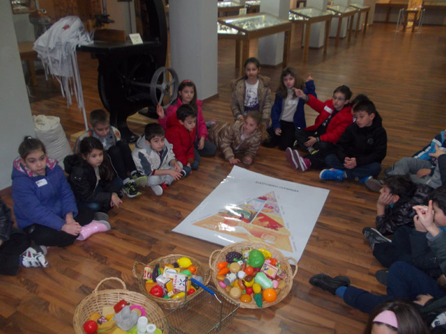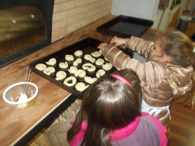Έπειτα, περάσαμε μπροστά από τις βιτρίνες με τις σφραγίδες που βάζουν οι νοικοκυρές στο πρόσφορο. Μετά, μπήκαμε στην κουζίνα βάλαμε τις ποδιές μας και ζυμώσαμε το δικό μας καρβελάκι. Μέχρι να ψηθεί πήγαμε για ψώνια και φτιάξαμε την πυραμίδα της διατροφής . Φεύγοντας πήραμε δώρο αλεύρι και βιβλία μαγειρικής.