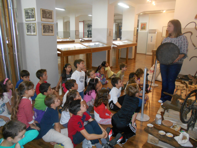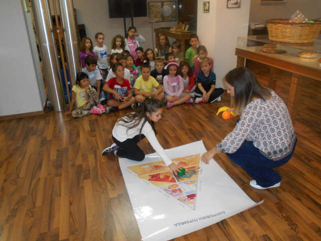 Πρώτα παρατηρήσαμε μέσα σε προθήκες του μουσείου τις σφραγίδες που έβαζαν οι νοικοκυρές στο πρόσφορο. Αμέσως μετά πλύναμε τα χέρια μας και βάλαμε τις ποδιές μας , για να ζυμώσουμε το δικό μας ψωμί. Χρειάστηκε χρόνο το ψήσιμο κι έτσι παρακολουθήαμε ένα βίντεο για την ιστορία του ψωμιού και είδαμε τα γεωργικά εργαλεία που χρησιμοποιούσαν οι άνθρωποι τα παλιότερα χρόνια στο θερισμό. Στο τέλος, φτιάξαμε την πυραμίδα της διατροφής, αφού μάθαμε ένα όμορφο παραμύθι. Φεύγοντας μας έδωσαν τα ψωμάκια που φτιάξαμε κι άλλα όμορφα αναμνηστικά δωράκια.