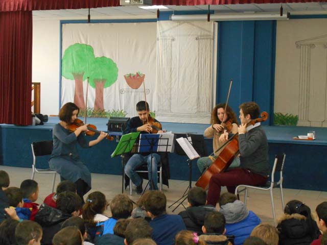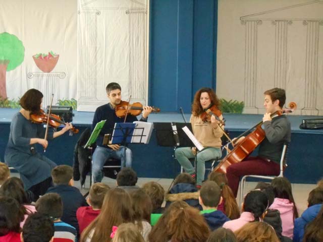Σήμερα, Παρασκευή 20 Ιανουαρίου 2016, το σχολείο μας επισκέφθηκαν μέλη της ΑΣΟΝ (Αθηναϊκής Συμφωνικής Ορχήστρας Νέων) και το Κουαρτέτο Εγχόρδων της παρουσίασε σε όλες τις τάξεις μια παράσταση κλασσικής Μουσικής.