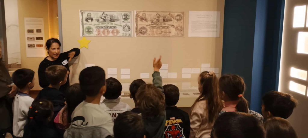 Σήμερα, Δευτέρα 6 Οκτωβρίου 2025, επισκεφτήκαμε το Ιστορικό Αρχείο της Εθνικής Τράπεζας. Εντυπωσιαστήκαμε από το μεγαλοπρεπές κτίριο και μπαίνοντας σταθήκαμε γύρω από το συντριβάνι της μνήμης. Έπειτα μπήκαμε σε μια αίθουσα, όπου κάναμε ένα ταξίδι στην ιστορία της μνήμης, δηλαδή στα αρχεία της ιστορίας μας, που αφορούν τα νομίσματα. Στις προθήκες του μουσείου είδαμε πολλά παλιά νομίσματα και χαρτονομίσματα και στο τέλος σχεδίασαμε το δικό μας χαρτονομισμα. Περάσαμε πολύ όμορφα οξύνοντας την σκέψη μας και καλλιεργώντας την φαντασία μας.