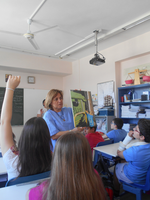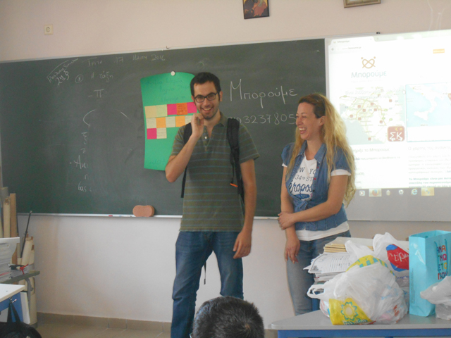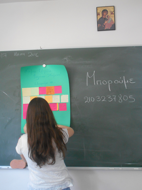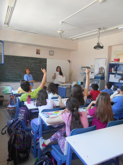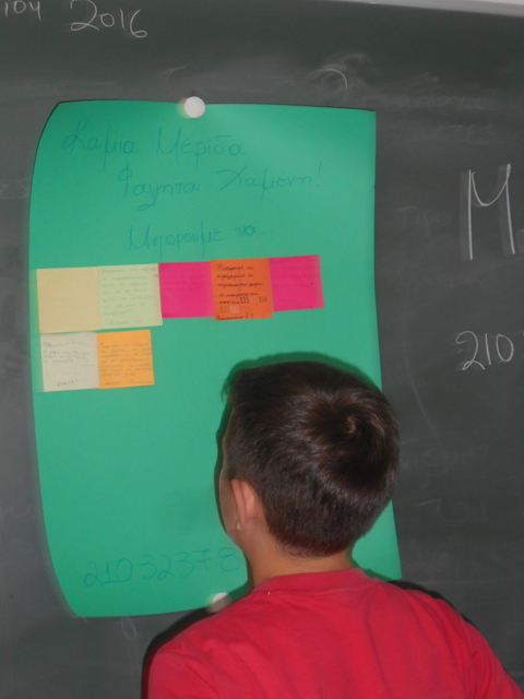Μας παρουσίασαν εικόνες για να σχολιάσουμε, μας έκαναν ερωτήσεις, μας έδειξαν την επίσημη ιστοσελίδα του συλλόγου “Μπορούμε“. Στο τέλος μάς έδωσαν χαρτάκια, για να γράψουμε λύσεις για το πρόβλημα του πετάγματος του φαγητού στα σκουπίδια. Όλα αυτά τα χαρτάκια τα κολλήσαμε σ’ ένα μεγάλο χαρτόνι, το οποίο θα στολίζει την τάξη μας. Στο τέλος, μας επισκέφθηκαν και δύο εθελοντές από την ΜΚΟ “Praksis“ που φροντίζει για τα λίγο μεγαλύτερα παιδιά από εμάς που έρχονται χωρίς κάποιο γονέα στην Ελλάδα για μια καλύτερη τύχη. Έπειτα, παρέλαβαν τα τρόφιμα που είχαμε συγκεντρώσει και τους ευχαριστήσαμε για την επίσκεψή τους. Περάσαμε πολύ ωραία!
