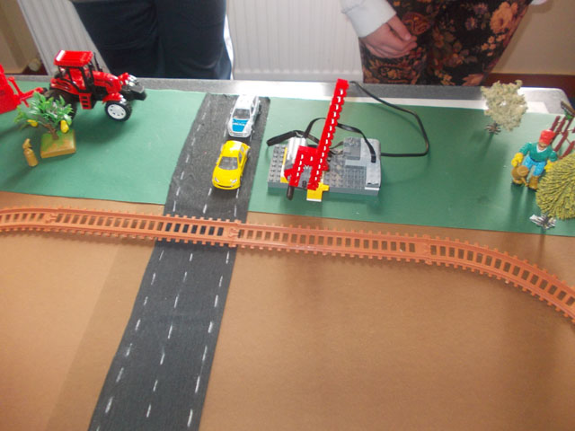 Με την ομάδα της ρομποτικής δημιουργήσαμε μια κατασκευή με την όποια θέλαμε να δείξουμε πώς λειτουργεί η διάβαση του τρένου. Με τουβλάκια LEGO κατασκευάσαμε μια μπάρα και από δίπλα τοποθετήσαμε ένα αισθητήρα κίνησης ο οποίος αντιλαμβανόταν πότε έρχεται το τρένο για να κλείνει.Τη διάβαση τρένου που κατασκευάσαμε τη συνδέσαμε στον υπολογιστή με usb και με το πρόγραμμα Scratch προγραμματίσαμε τις εντολές οι οποίες ρύθμιζαν την μπάρα να ανοίγει όταν φεύγει το τρένο και και να κλείνει όταν έρχεται. Στη συνέχεια φτιάξαμε μια μακέτα και αποφασίσαμε να βρίσκεται το τρένο στην εξοχή. Κατασκευάσαμε μια φάρμα και ένα δρόμο που υποθετικά θα περιμένουν τα αυτοκίνητα να περάσουν όταν ανοίξει η μπάρα .Στο τέλος τοποθετήσαμε στη μακέτα το τρένο με τις ράγες και τη διάβαση του τρένου.Το αποτέλεσμα ήταν εκπληκτικό. Χαρήκαμε τόσο πολύ που πέτυχε η κατασκευή μας. Απολαύσαμε το τέλος βγάζοντας φωτογραφίες όλη η ομάδα και δείχνοντας τη μακέτα!