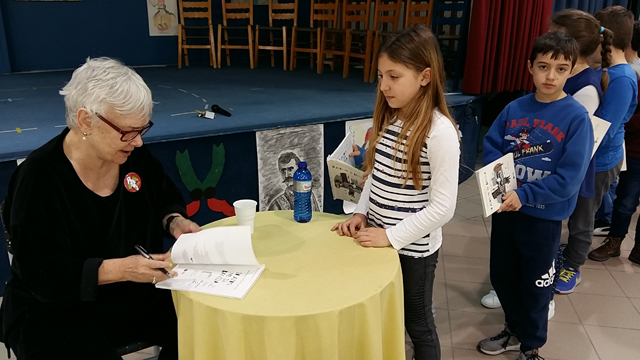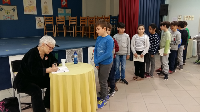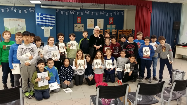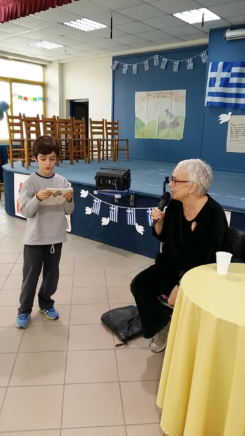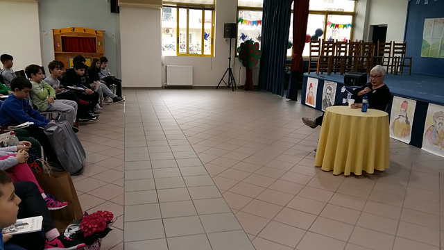 Αφορμή για την επίσκεψή της στάθηκε το βιβλίο της “Το αγόρι με τη βαλίτσα“, που διαβάσαμε και επεξεργαστήκαμε στην τάξη μας όλο το προηγούμενο διάστημα. Αρχικά, γνωριστήκαμε μαζί της και της θέσαμε κάποιες ερωτήσεις για τη ζωή της, την καλλιτεχνική της πορεία και την αφήγηση παραμυθιών, που μας είχαν απασχολήσει ιδιαίτερα. Έτσι, καταφέραμε να τη γνωρίσουμε καλύτερα! Έπειτα, συζητήσαμε διεξοδικά για το μείζον θέμα των καιρών μας, το προσφυγικό ζήτημα. Είχαμε και την ευκαιρία να την απολαύσουμε στην αφήγηση ενός παραμυθιού με το δικό της ξεχωριστό τρόπο. Τέλος, μας υπέγραψε τα βιβλία μας κια την ευχαριστήσαμε θερμά που μας επισκέφθηκε, αφού της προσφέραμε τα δώρα, που της είχαμε ετοιμάσει.