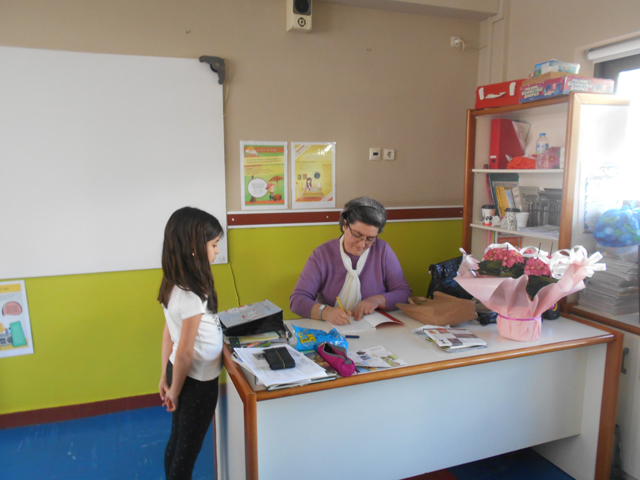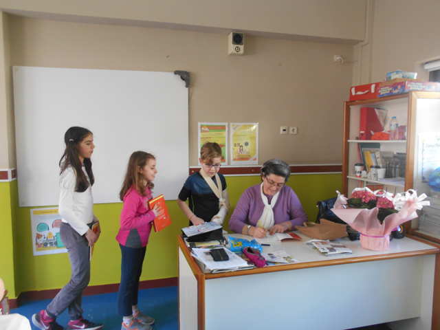 Μέσα από το υπέροχο, ειδικά γραμμένο για παιδιά βιβλίο της, όλους αυτούς τους μήνες ήρθαμε σε επαφή με την αρχαία ελληνική γλώσσα, τη γνωρίσαμε αρκετά και τη συνδέσαμε με τη νέα Ελληνική. Η επίσκεψη της κυρίας Τσομάκου μας έδωσε την ευκαιρία να μάθουμε ακόμη πιο πολλά πράγματα για τη γλώσσα των προγόνων μας μιας και μας έκανε την τιμή να μας προσφέρει ένα μάθημα αρχαίων Ελληνικών μέσα από το οποίο αποκομίσαμε χρήσιμες γνώσεις. Στη συνέχεια η συγγραφέας υπέγραψε τα βιβλία μας και μάς χάρισε πολλά δώρα. Την αποχαιρετήσαμε με την ελπίδα ότι θα την ξαναδούμε σύντομα!