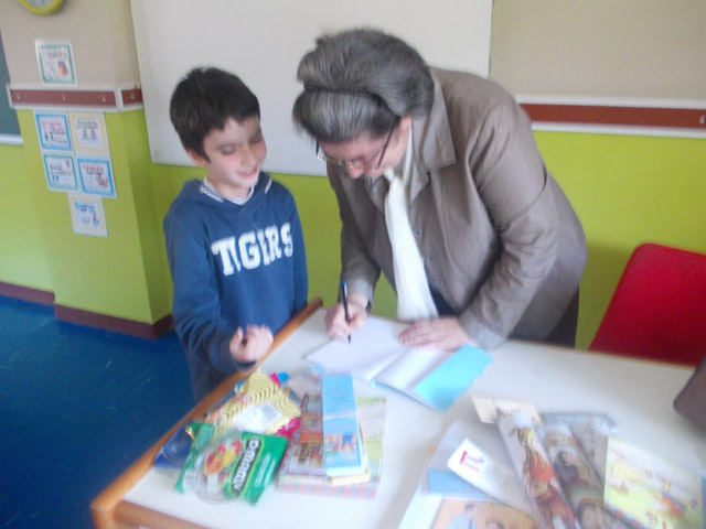 Έχοντας ολοκληρώσει και τα τρία τεύχη της σειράς “Η Φανή μαθαίνει αρχαία Ελληνικά“, είχαμε την ευκαιρία να παρακολουθήσουμε ένα μάθημα αρχαίων Ελληνικών αποκομίζοντας χρήσιμες γνώσεις. Στη συνέχεια η συγγραφέας υπέγραψε τα βιβλία μας και μάς χάρισε πολλά δώρα. Την αποχαιρετήσαμε με την ελπίδα ότι θα την ξαναδούμε σύντομα.