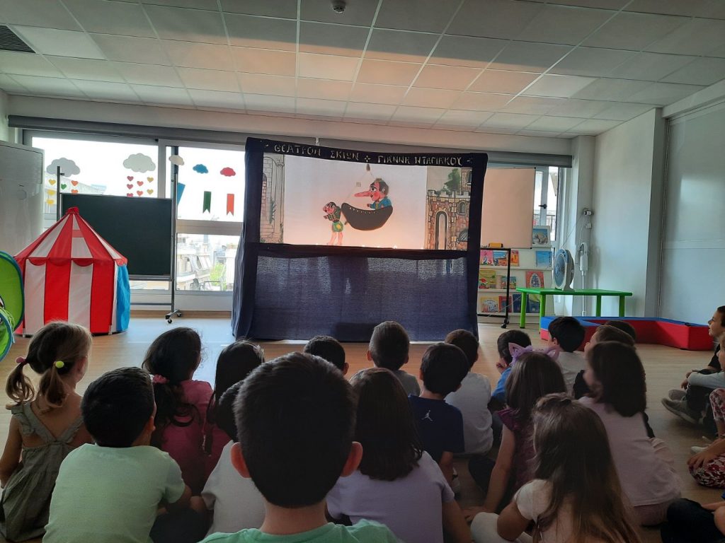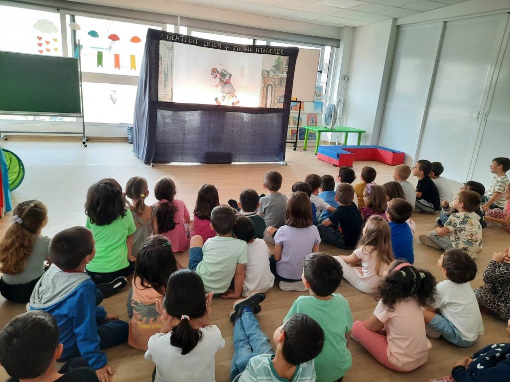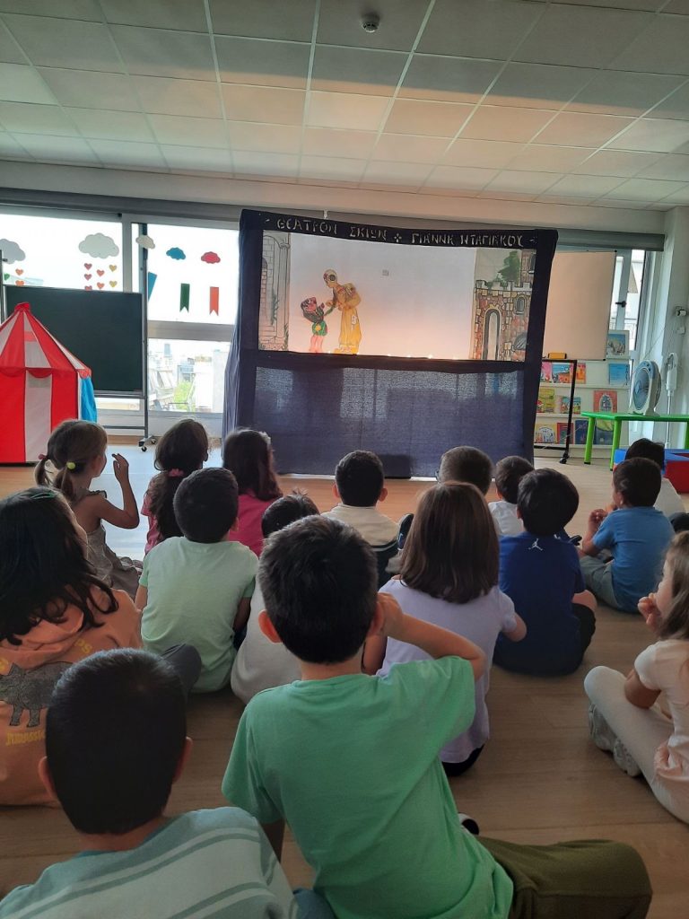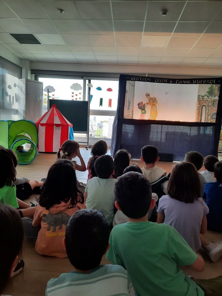 Σήμερα, Δευτέρα 23/10/2023, στο σχολείο μας, παρακολουθήσαμε το θέατρο Σκιών του κύριου Γιάννη Νταγιάκου “Ο Καραγκιόζης στο έπος του 40”. Γελάσαμε, χορέψαμε, τραγουδήσαμε μαζί με τον Καραγκιόζη και το βοηθήσαμε να μαζέψει προμήθειες για τους στρατιώτες που πολεμούσαν στο μέτωπο. Αποτρέψαμε τους Ιταλούς να πάρουν την Ελλάδα και κατατροπώσαμε τους Γερμανούς. Στο τέλος, γλεντήσαμε τη νική μας με χορό και τραγουδι.