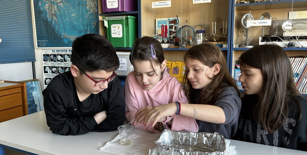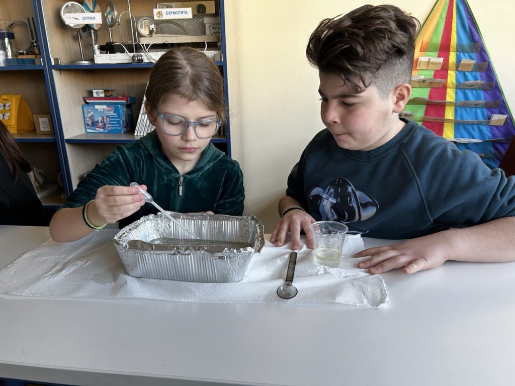 Μελετώντας τις ιδιότητες του νερού οι μαθητές και μαθήτριες του Δ1′ κλήθηκαν από τον συνεργάτη μας Δρ. Βασίλη Γρηγορίου να φτιάξουν ένα μοντέλο καθαρισμού των θαλασσών από τις πετρελαιοκηλίδες.