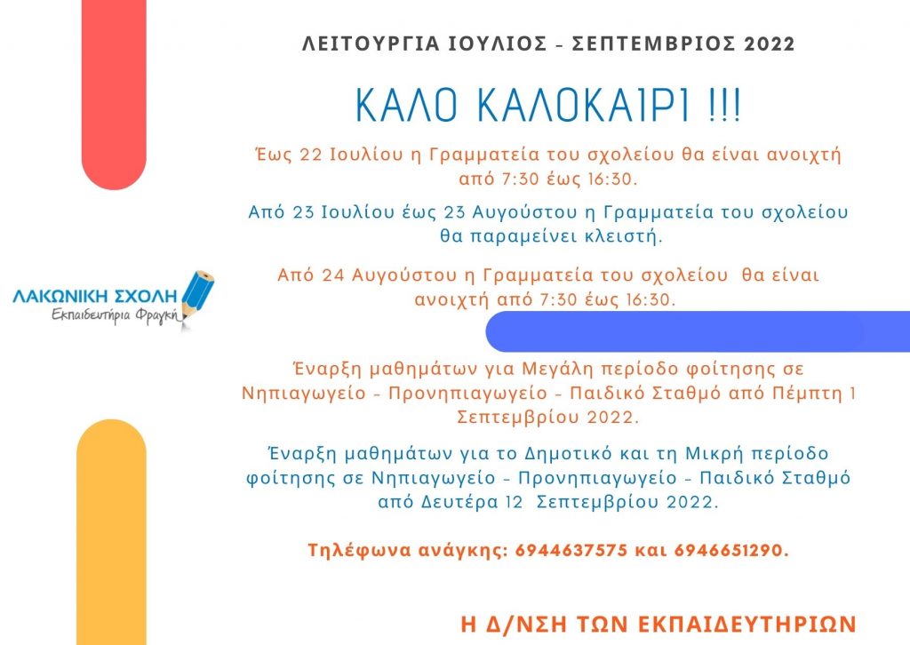 Λειτουργία εκπαιδευτηρίων Ιούλιος – Σεπτέμβριος 2022