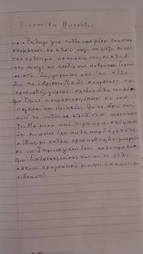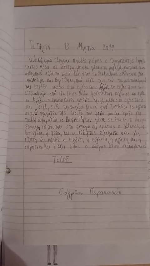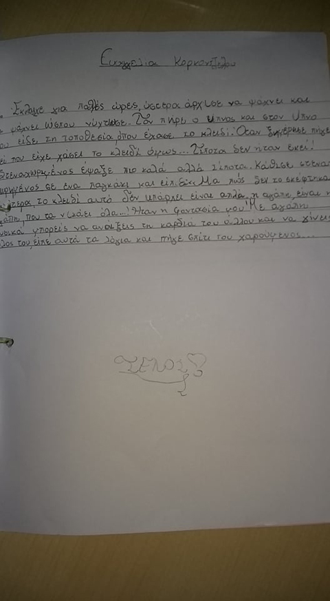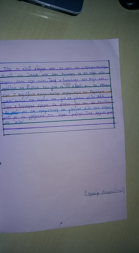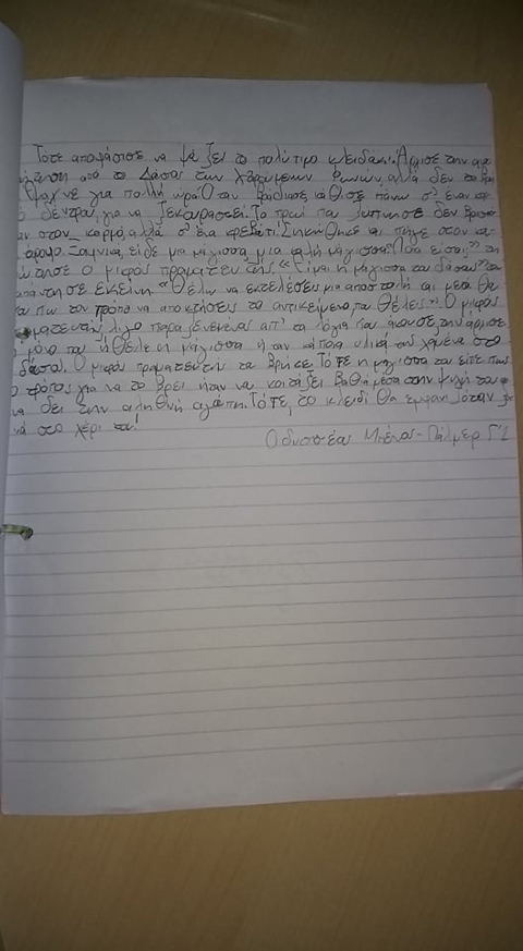 Αντλώντας έμπνευση από το κλειδάκι της αγάπης, που έχασε ο πραματευτής, φαντάστηκε και κατέγραψε ο καθένας μας τη δική του εκδοχή για το πώς και πού βρέθηκε τελικά το κλειδάκι της αγάπης κι αν ολοκλήρωσε τον σκοπό του, που ήταν να “ανοίγει“ τις καρδιές των ανθρώπων. Έτσι, το Σάββατο 16/3 η δασκάλα μας συνάντησε την κα Βαλάση και με μεγάλη μας χαρά της παρέδωσε τις ιστορίες μας, που τις είχαμε φτιάξει σαν ένα μικρό βιβλίο. Μας μετέφερε τη μεγάλη χαρά με την οποία η συγγραφέας τις πήρε για να τις μελετήσει.