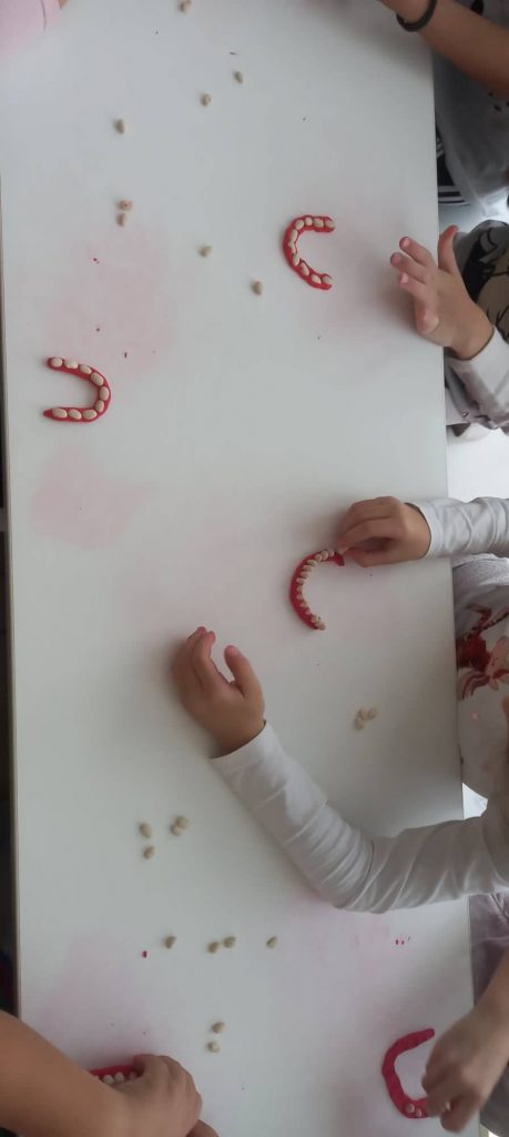 Με απλά υλικά και με πολύ καλή διάθεση, εμπλακήκαμε σε μια σειρά πειραματισμών, διαδικασία η οποία μας πρόσφερε πολύτιμες γνώσεις μέσα από την παρατήρηση και την ανακάλυψη. Έτσι, καταλάβαμε πόσο σημαντική είναι η σωστή φροντίδα των δοντιών μας, όπως και ο τακτικός οδοντιατρικός έλεγχος, προκειμένου να έχουμε μια υγιή οδοντοστοιχία. Στη συνέχεια εμπλουτίσαμε τις γνώσεις μας κάνοντας κατασκευές, συμπληρώνοντας φύλλα εργασίας και εφαρμόζοντας όσα μάθαμε σε ένα ομοίωμα οδοντοστοιχίας.