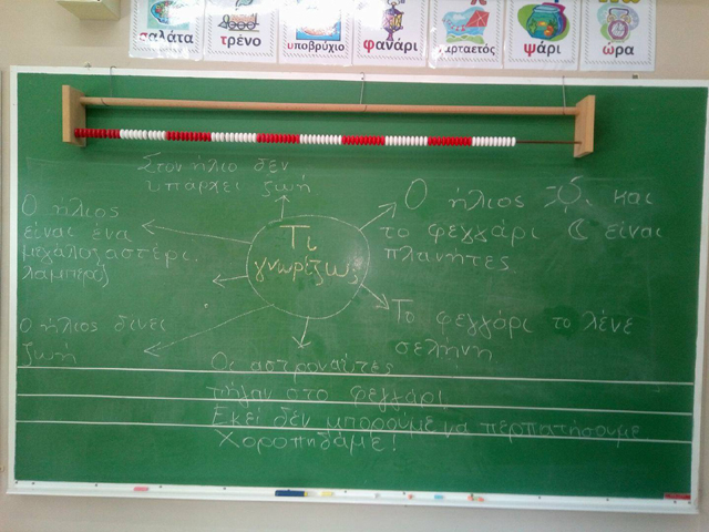 Οι μαθητές έδειξαν ιδιαίτερο ενδιαφέρον για τον Ήλιο και τη Σελήνη και γνώριζαν ήδη πολλές πληροφορίες. Αφού καταγράψαμε όσα γνωρίζουμε, ακολούησε καταιγισμός ερωτήσεων γι’ αυτά που θα θέλαμε να μάθουμε ακόμα. Έχουμε όλη τη χρονιά μπροστά μας για έρευνα, πειραματισμό και ενασχόληση με διάφορες δραστηριότητες, για να μάθουμε όσα περισσότερα μπορούμε.