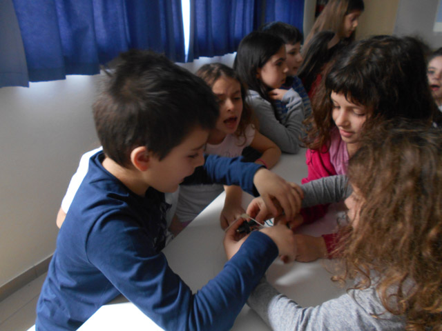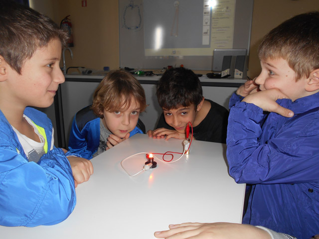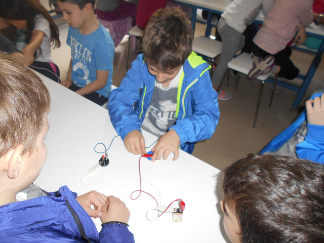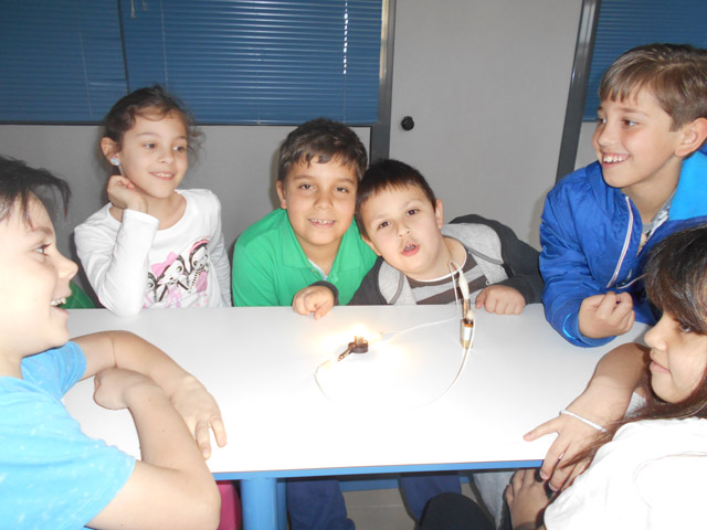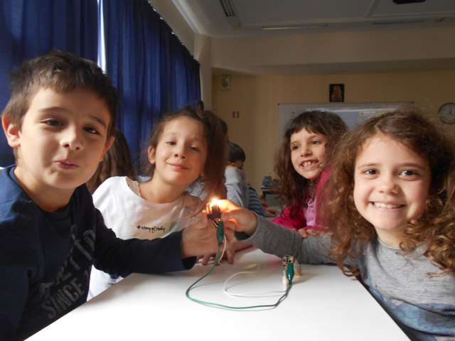 Μιλήσαμε για το ηλεκτρικό ρεύμα και τα χαρακτηριστικά του και κατασκευάσαμε δικά μας ηλεκτρικά κυκλώματα χρησιμοποιώντας λαμπάκια, μπαταρίες, διακοπές και καλώδια “κροκοδειλάκια“. Μάθαμε πολλά καινούργια πράγματα και νιώσαμε μεγάλη χαρά και ικανοποίηση μέσα από τα πειράματα που κάναμε!