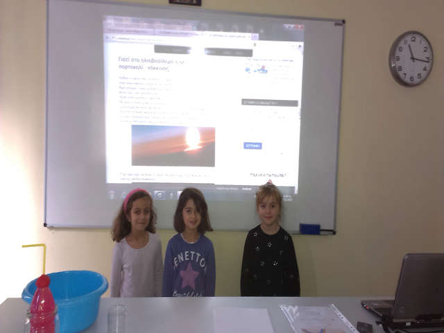 Χρησιμοποιώντας καθημερινά υλικά (ένα γυάλινο ποτήρι, συμπυκνωμένο γάλα και ένα φακό) κάναμε ένα ηλιοβασίλεμα μέσα στο ποτήρι μας. Αφού εξηγήσαμε το φαινόμενο συμπληρώσαμε σχετικό φύλλο εργασίας.Περάσαμε υπέροχα!!!