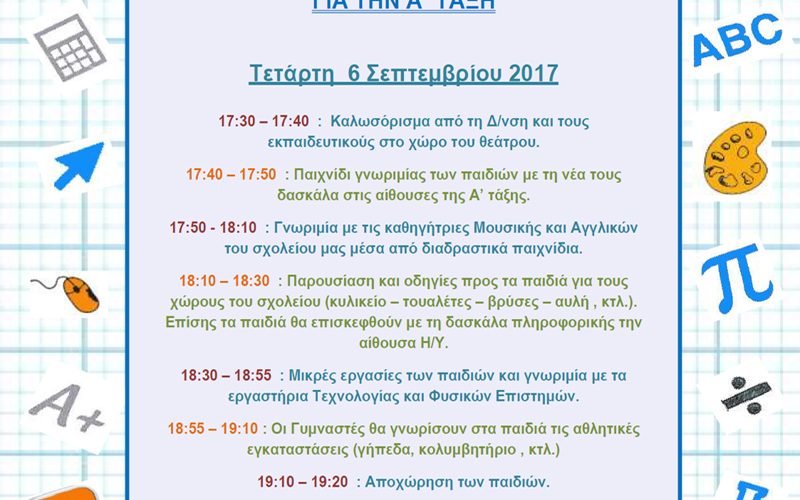 Παρακάτω σας παραθέτουμε το πρόγραμμα της ημέρας γνωριμίας για τους μαθητές της Α’ τάξης στις 6 Σεπτεμβρίου 2017.