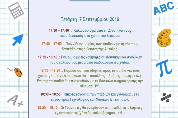 Παρακάτω σας παραθέτουμε το πρόγραμμα της ημέρας γνωριμίας για τους μαθητές της Α’ τάξης στις 7 Σεπτεμβρίου 2016.