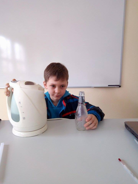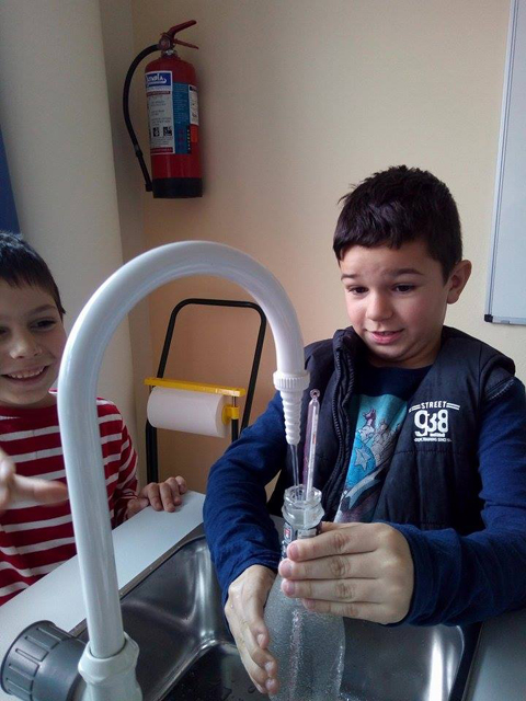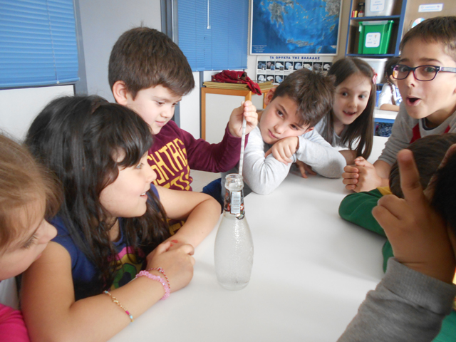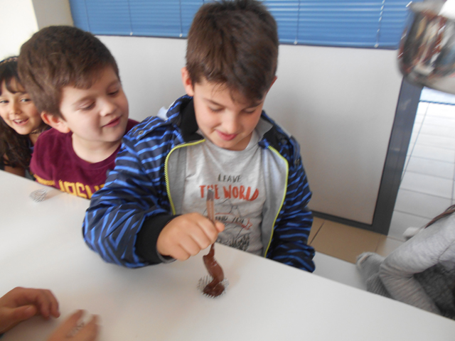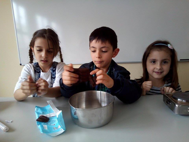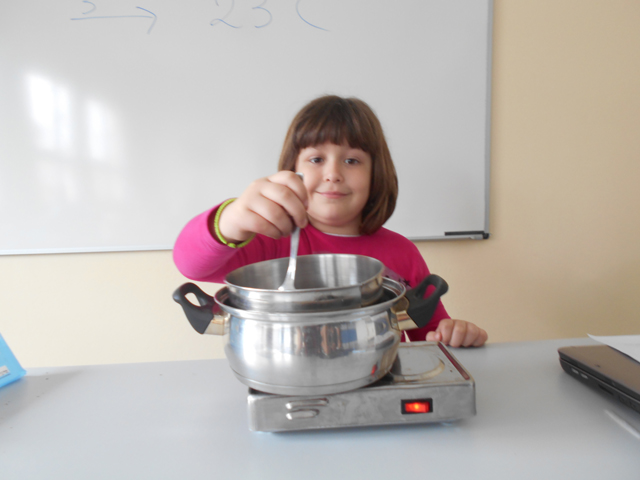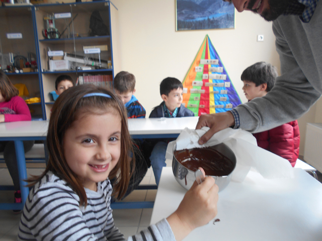 Στην αρχή συζητήσαμε για δυο πολύ σημαντικές έννοιες της φυσικής, τη θερμότητα και τη θερμοκρασία και μέσα από πολλά παραδείγματα εντοπίσαμε τη διαφορά τους. Έπειτα τοποθετήσαμε ζεστό νερό σε ένα μπουκάλι, μετρήσαμε και σημειώσαμε τη θερμοκρασία του. Προσθέσαμε κρύο νερό και παρατηρήσαμε την πτώση της θερμοκρασίας. Στη συνέχεια ακολούθησε αυτό που όλοι περιμέναμε με ανυπομονησία. Μαύρη σοκολάτα, μπεν μαρί, σιγανή φωτιά και καλό ανακάτεμα… Μύρισε όλο το σχολείο σοκολάτα!!! Καλή μας όρεξη!!!