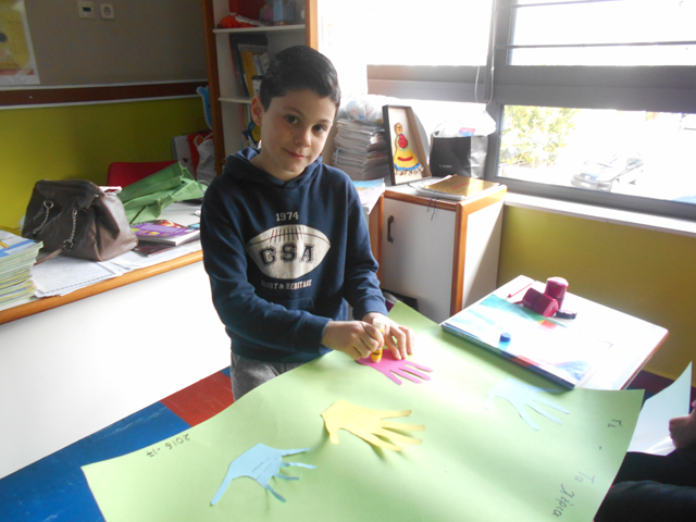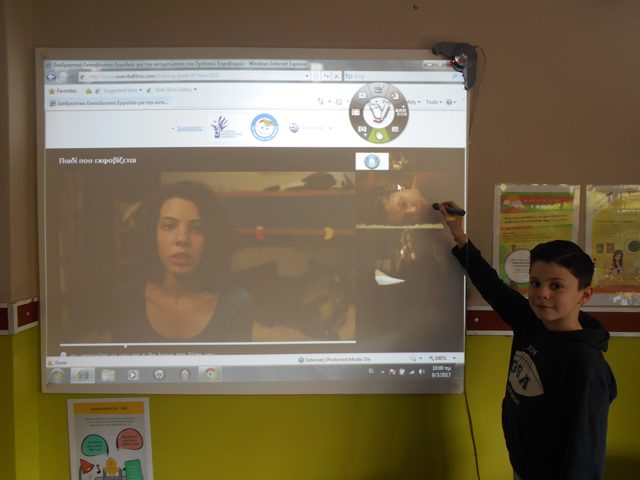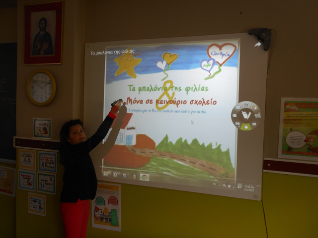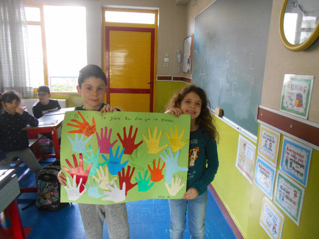 Αρχικά διαβάσαμε το παραμύθι “Τα μπαλόνια της φιλίας“ και στη συνέχεια αξιοποιήσαμε ένα ειδικά διαμορφωμένο διαδραστικό εκπαιδευτικό υλικό, το οποίο μας επέτρεψε να γίνουμε εικονικοί μάρτυρες μιας ιστορίας εκφοβισμού. Επιπρόσθετα, οι εφαρμογές του μας πρόσφεραν τη δυνατότητα να γνωρίσουμε τόσο την πλευρά του θύτη όσο και την πλευρά του θύματος και το σημαντικότερο να δώσουμε εμείς το τέλος, που κατά την κρίση μας και άρμοζε. Για να θυμόμαστε όλα όσα μάθαμε, φτιάξαμε μια αφίσα εναντίον του εκφοβισμού. Σύνθημά μας: “ΔΩΣΕ ΕΝΑ ΧΕΡΙ ΒΟΗΘΕΙΑΣ , ΟΧΙ ΕΝΑ ΧΕΡΙ ΞΥΛΟ“.