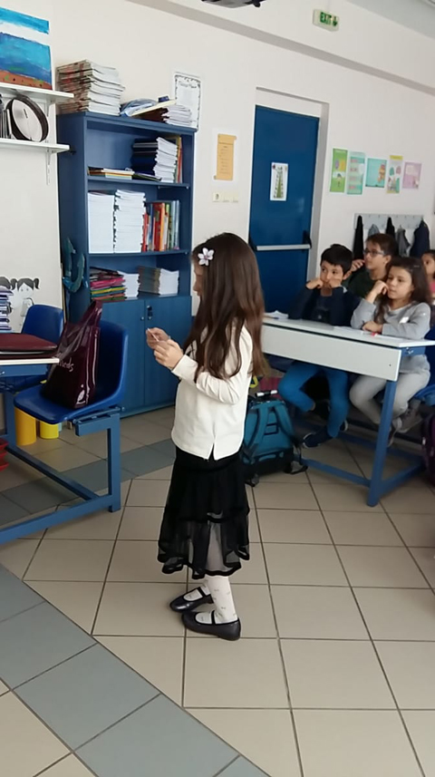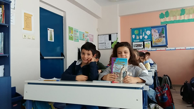 Αφού διαβάσαμε στην τάξη μας το βιβλίο του “Η καμπανούλα της Ειρήνης“ και συζητήσαμε τις έννοιες και τα μηνύματα, που θέλει να μας περάσει, μας δημιουργήθηκαν αρκετές απορίες, τις οποίες είχαμε την ευκαιρία να λύσουμε μέσα από μια γόνιμη κι εποικοδομητική συζήτηση μαζί του. Μας εξήγησε πώς εμπνεύστηκε την ιδέα για το παραμύθι του, για το μήνυμα της ειρήνης, που θέλει να περάσει σε όλο τον κόσμο, αλλά μας έδειξε και φωτογραφίες από την αληθινή βόμβα, που μετατράπηκε σε καμπάνα χωριού της Βοιωτίας! Μάλιστα, μας συμβούλεψε να διαβάσουμε πολύ και να αξιοποιούμε τα ερεθίσματα που δεχόμαστε. Χαρήκαμε ιδιαίτερα, που τον γνωρίσαμε και τον ευχαριστούμε ιδιαίτερα.