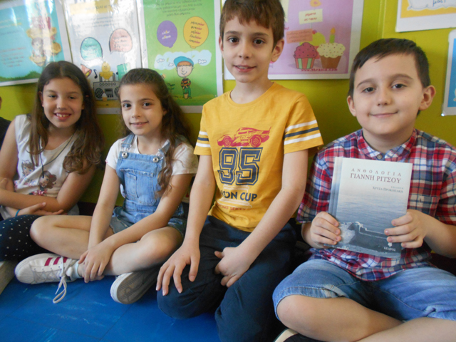 Σήμερα, λοιπόν, Τετάρτη 9 Μαΐου 2018, είχαμε την τιμή και τη χαρά να συνομιλήσουμε μαζί της στο τηλέφωνο. Εκείνη στο σπίτι της στη Σάμο κι εμείς στην τάξη μας, είχαμε μια πολύ εποικοδομητική συζήτηση, για να γνωρίσουμε την ίδια και τον ποιητή – πατέρα της. Συζητήσαμε για τον Γιάννη Ρίτσο ως ποιητή και ως πατέρα, για το κορυφαίο ποίημά του “Επιτάφιος“, αλλά και για το ποίημά του, που εκείνη αγαπά περισσότερο. Καταφέραμε, έτσι, να αντιληφθούμε τη σπουδαιότητα αυτού του ποιητή.