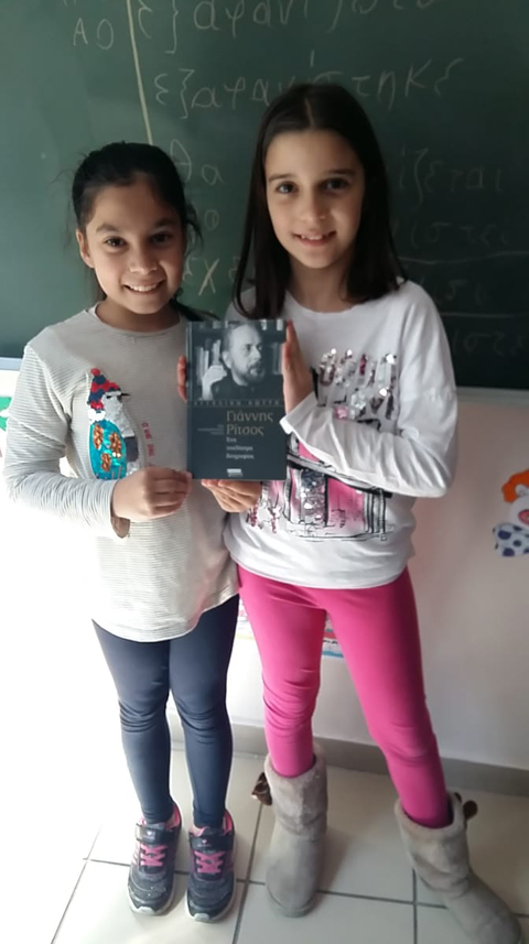 Σήμερα, λοιπόν, Τετάρτη 6 Μαρτίου 2019, είχαμε την τιμή και τη χαρά να συνομιλήσουμε μαζί της στο τηλέφωνο. Εκείνη στο σπίτι της στη Σάμο κι εμείς στην τάξη μας, είχαμε μια πολύ εποικοδομητική συζήτηση, για να γνωρίσουμε την ίδια και τον ποιητή – πατέρα της. Συζητήσαμε για τον Γιάννη Ρίτσο ως ποιητή και ως πατέρα, για το κορυφαίο ποίημά του “Επιτάφιος“, αλλά και για το ποίημά του, που εκείνη ξεχωρίζει τη “Σονάτα του Σεληνόφωτος“. Καταφέραμε, έτσι, να αντιληφθούμε τη σπουδαιότητα αυτού του ποιητή.