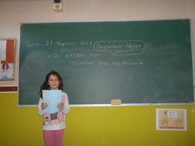 Σήμερα, Τρίτη 21 Μαρτίου, οι στίχοι των ποιητών μας ταξίδεψαν σε κόσμους παράξενους και μαγικούς. Με αφορμή την Παγκόσμια Ημέρα Ποίησης, ετοιμάσαμε στην τάξη μας μια γιορτή γεμάτη στίχους των αγαπημένων μας Ελλήνων ποιητών.