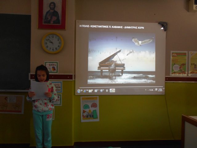 Κάθε μαθητής διάβασε το ποίημά του την ολομέλεια της τάξης, χαρίζοντάς μας όμορφες εικόνες. Στη συνέχεια στα πλαίσια της δημιουργικής γραφής γράψαμε τα δικά μας ποιήματα, τα οποία αναγνώσαμε στους συμμαθητές μας κερδίζοντας το χειροκρότημά τους. Κλείνοντας θα θέλαμε να αφιερώσουμε σε όλους τους συμμαθητές μας το ποίημα του Κωνσταντίνου Καβάφη “Το πρώτο σκαλί” ώστε να τους ενθαρρύνουμε στα πρώτα τους βήματα στη σκάλα της γνώσης.