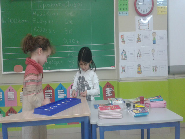 Αναλάβαμε το ρόλο του πωλητή και του πελάτη και χρησιμοποιώντας απομιμήσεις νομισμάτων πραγματοποιήσαμε διάφορες συναλλαγές. Κάναμε όλοι πολύ καλή δουλειά και έτσι το βιβλιοπωλείο μας θα ανοίξει ξανά σύντομα….