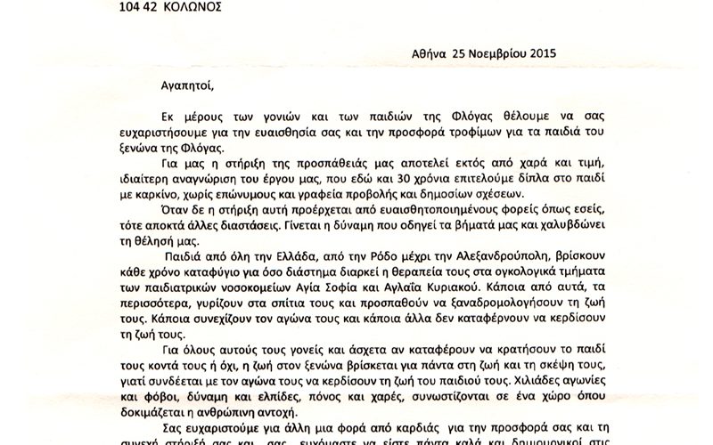 Με πολλή χαρά παραδώσαμε τα τρόφιμα , που είχαμε συγκεντρώσει με σκοπό να βοηθήσουμε με τον τρόπο μας τα παιδιά που βρίσκονται αντιμέτωπα με σοβαρές ασθένειες. Μάλιστα είχαμε την ευκαιρία να γνωρίσουμε κάποια από αυτά και να μιλήσουμε μαζί τους . Θαυμάσαμε το θάρρος και το ψυχικό μεγαλείο τους . Τους ευχόμαστε ολόψυχα γρήγορη ανάρρωση.