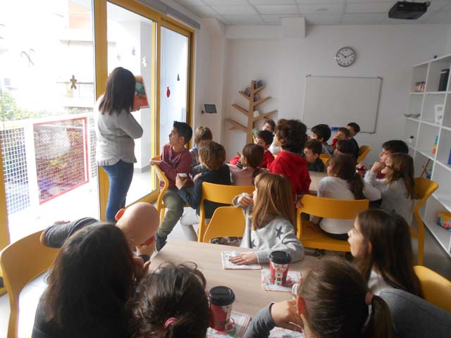 Χριστουγεννιάτικες μελωδίες πλημμύρισαν τα αυτιά μας δημιουργώντας εορταστική ατμόσφαιρα και η μυρωδιά της ζεστής σοκολάτας, που ήταν διάχυτη στον χώρο προμήνυε ότι κάτι όμορφο θα ακολουθούσε. Χωρίς να χάσουμε χρόνο, λοιπόν, πήραμε τις θέσεις μας περιμένοντας όσα θα ακολουθούσαν. Με πολλή ενδιαφέρον ακούσαμε την αφήγηση του βιβλίου του αγαπημένου μας συγγραφέα Ευγένιου Τριβιζά «Ένα ελατάκι για τον Τάκη» . Η αφιέρωση του ίδιου του συγγραφέα στην αρχή του βιβλίου αμέσως κέντρισε το ενδιαφέρον μας: