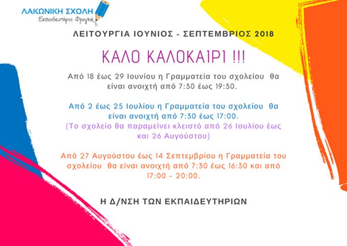 ΩΡΑΡΙΟ ΛΕΙΤΟΥΡΓΙΑΣ ΙΟΥΝΙΟΣ – ΣΕΠΤΕΜΒΡΙΟΣ 2018