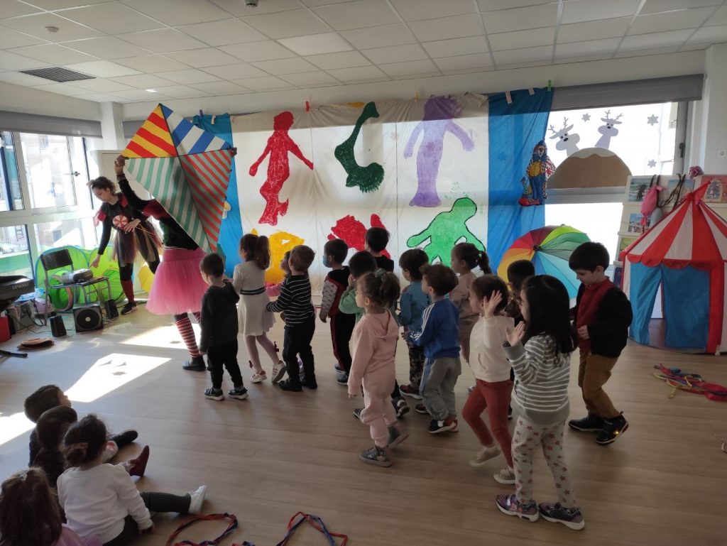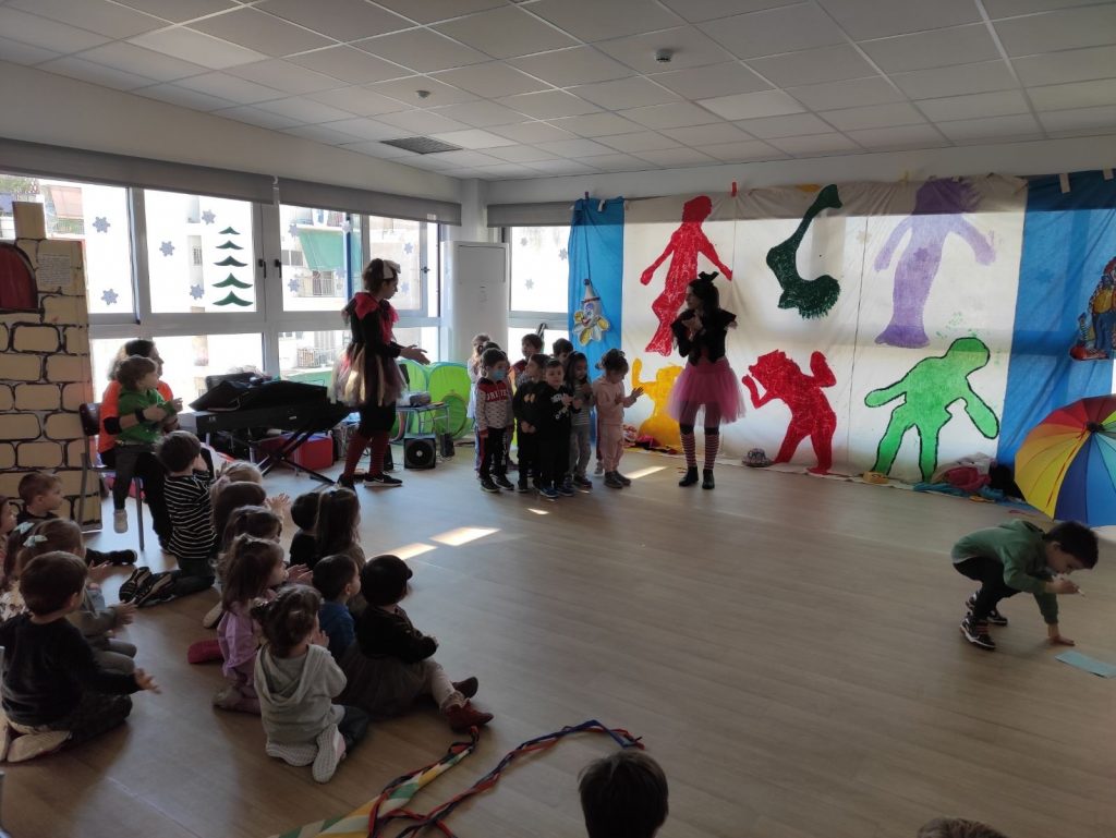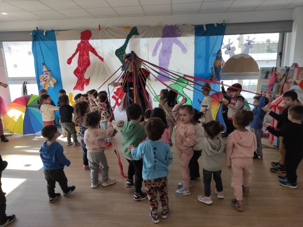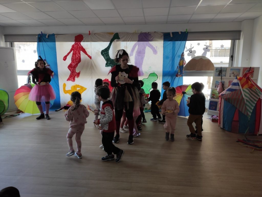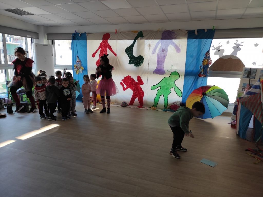 Σήμερα Τρίτη 21 Φεβρουαρίου 2023 τα παιδιά των τμημάτων Ν2’Α & Ν2’Β παρακολούθησαν αποκριάτικη θεατρική παράσταση με τίτλο « Ένας παλιάτσος μια φορά». Ο Φλεβάρης έχει βάλει τη σφραγίδα «Καρναβάλι».Κι ύστερα φωνάζει «Εμπρός τώρα γλέντι και χορός». Πω πω χρώματα στολές γελια θόρυβος χαρες.και μέσα σ αυτή την τρελή παρέλαση συναντήσαμε και εμείς τον παλιάτσο. Ήταν όμως πολύ λυπημένος.Ταξιδέψαμε και βάλαμε τα μαγικά καπέλα και τις μαγικές μάσκες για να τον κάνουμε χαρούμενο αλλά μάταια.Η βοηθός μας η Πιν-Πον μας βοηθησε και φτιάξαμε καραμέλες και γλειφιτζούρια κι έτσι ο παλιάτσος μας ξανά βρηκε το χαμόγελο του. Μας παρέσυρε τότε στο χορο του καρναβαλιού και χορέψαμε όλοι μαζί γύρω από το μαγικό Γαϊτανάκι!