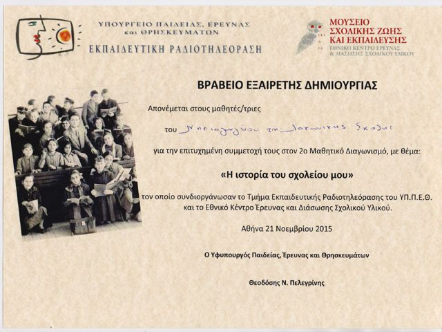 Το σχολείο μας με χαρά σας ανακοινώνει την τιμητική βράβευση απ’ το υπουργείο Παιδείας, Έρευνας και Θρησκευμάτων στα πλαίσια του 2ου μαθητικού Διαγωνισμού με θέμα: “Η ιστορία του σχολείου μου“, για το σχολικό έτος 2014-2015.
