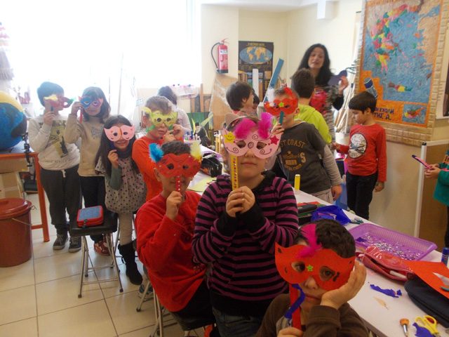 Σήμερα , Παρασκευή 6 Φεβρουαρίου 2015, με την εικαστικό του σχολείου μας, κυρία Μπουράνη φτιάξαμε αποκριάτικες μάσκες. Τις στολίσαμε με πούπουλα , αυτοκόλλητα, πούλιες και χρυσόσκονη.