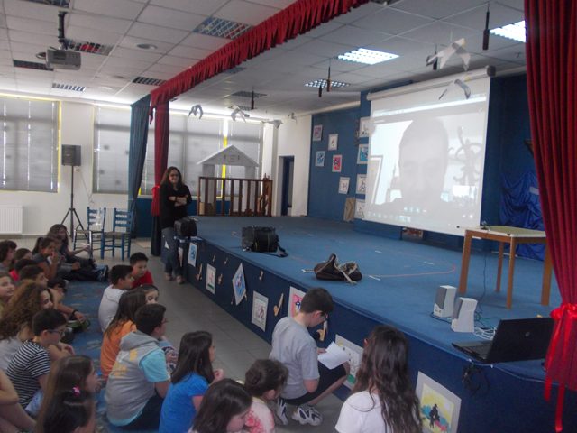 Σήμερα, Παρασκευή 13 Μαΐου 2016, οι τάξεις Ε1′ και Ε2′ επισκέφθηκαν το θέατρο του σχολείου μας. Εκεί είχαμε την τιμή να συνομιλήσαμε μέσω Skype με τον συγγραφέα Γκουίντο Κόντι.